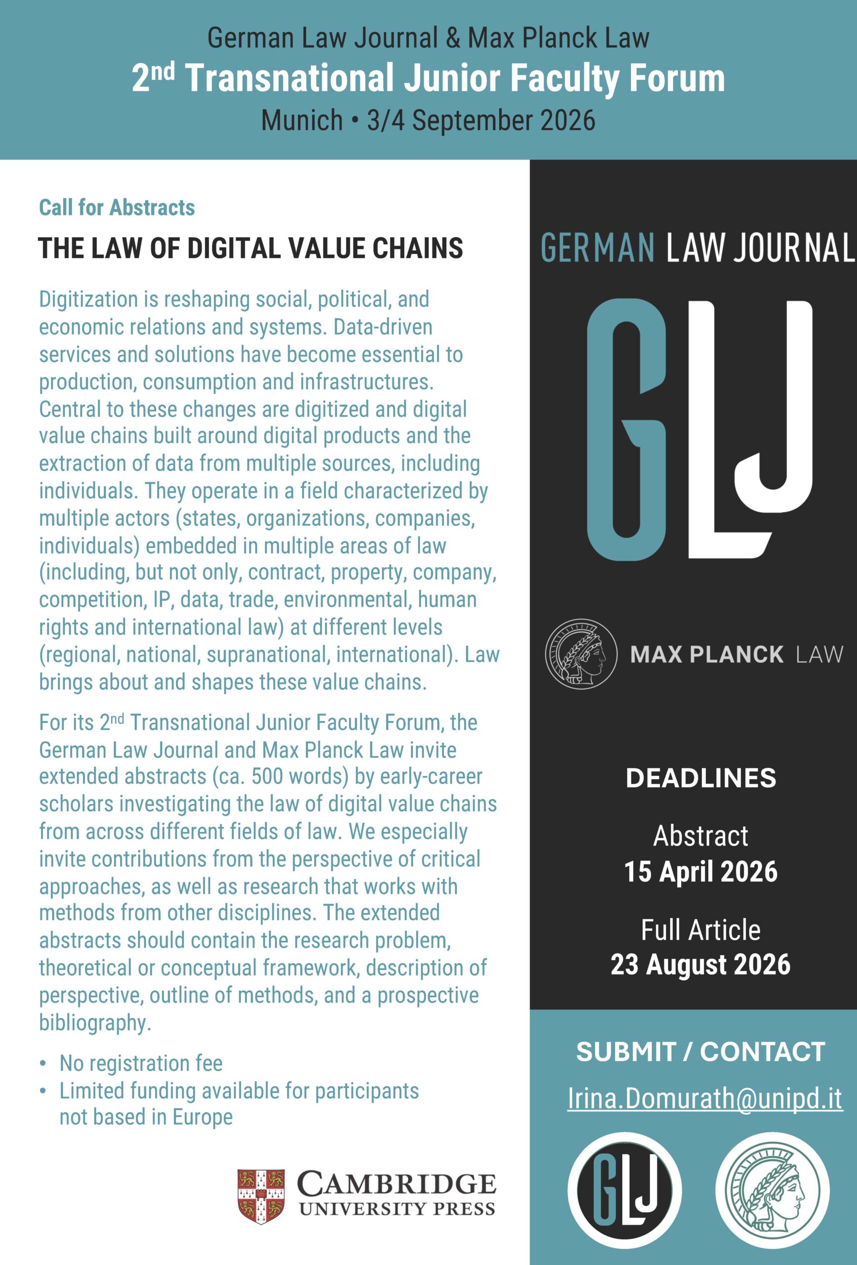 Nachwuchswissenschaftlerinnen und -wissenschaftler sind herzlich eingeladen, Extended Abstracts (ca. 500 Wörter) bis zum 15. April 2026 bei Irina Domurath einzureichen. Für die Einreichung des Volltext gilt die Frist bis zum 23. August 2026. Gesucht werden Beiträge, die das Recht digitaler Wertschöpfungsketten untersuchen – insbesondere auch aus kritischer Perspektive oder unter Einbeziehung interdisziplinärer Methoden.