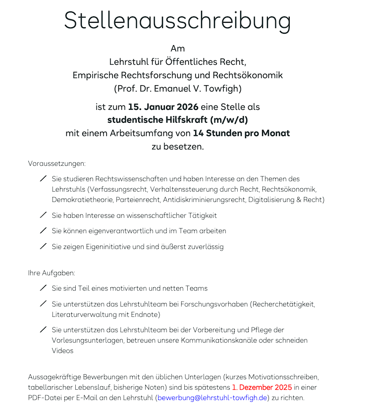 Am Lehrstuhl für Öffentliches Recht, Empirische Rechtsforschung und Rechtsökonomik (Prof. Dr. Emanuel V. Towfigh) ist zum 15. Januar 2026 eine Stelle als studentische Hilfskraft (m/w/d) mit einem Arbeitsumfang von 14 Stunden pro Monat zu besetzen.