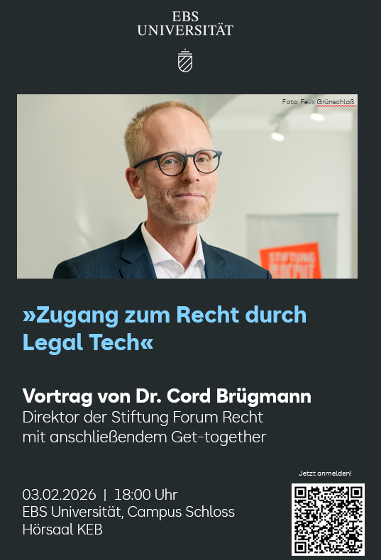 Am Dienstag, den 3. Februar 2026 lädt der Lehrstuhl von Prof. Dr. Emanuel V. Towfigh herzlich zu einem Vortrag von Dr. Cord Brügmann zum Thema »Zugang zum Recht durch Legal Tech« an der EBS Universität für Wirtschaft und Recht ein.